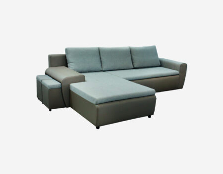 Диван‑трансформер з ламінованим столиком і можливістю комбінування частин.